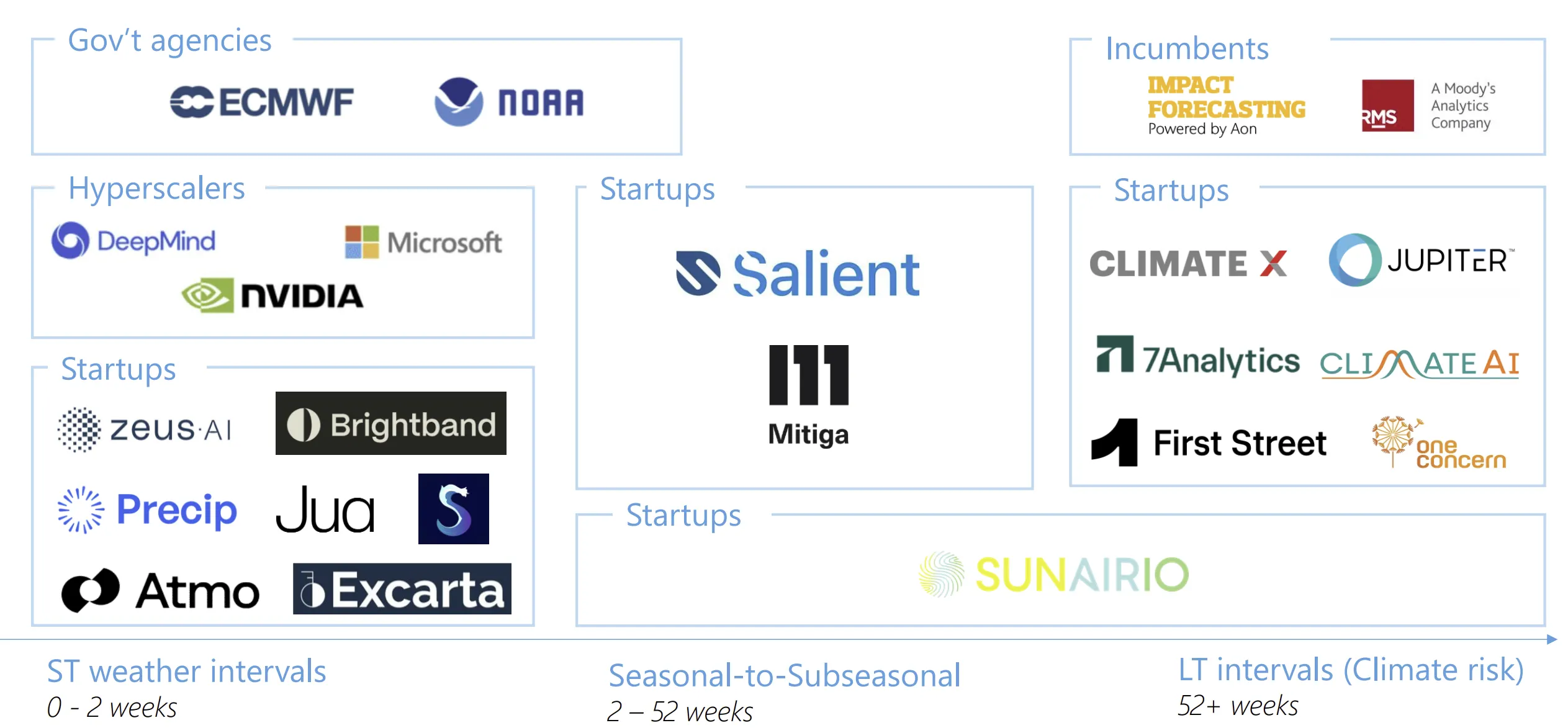 Time horizons matter when assessing weather models & their applications. Different companies tackling the weather space have found their own wedges categorized by the time-horizons across which they predict, as well as unique inputs, such as the sensor data mentioned above.