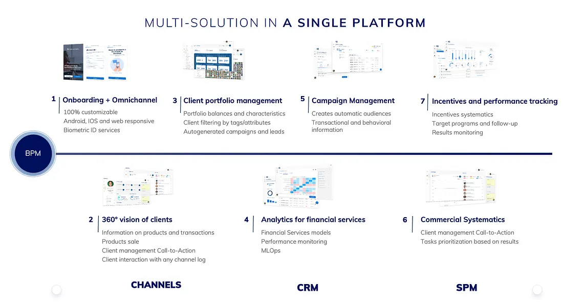 - Unique features: 360degree customer view, FS analytics, prioritization of CTAs to change sales strategy, tailor made campaigns, real time view of performance across various product lines