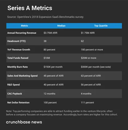 In the minds of most founders, a Series A is the first non-friends and family round. In the minds of most investors however, a Series A is growth funding for a company that has a commercially viable product, usually demonstrated through a c$1m+ ARR. The amount raised varies enormously depending on the rate of growth, size of opportunity, revenue profile and region, as you can see from the tables collated by OpenView and Wing VC (published in TechCrunch).